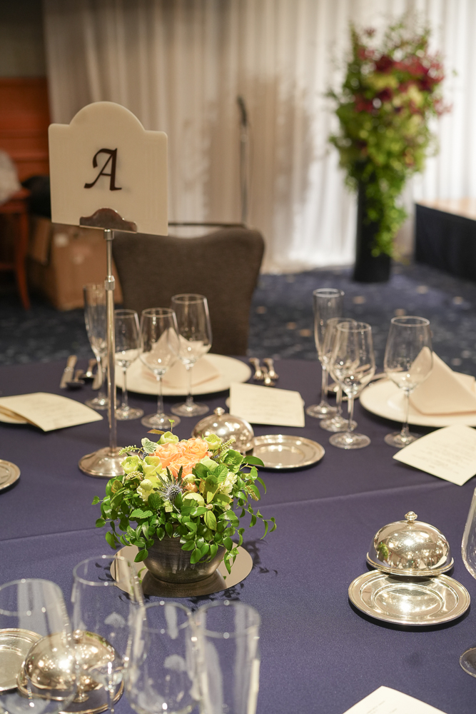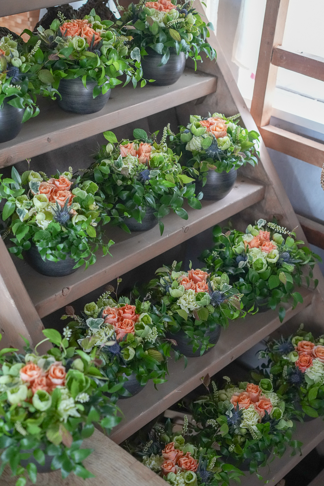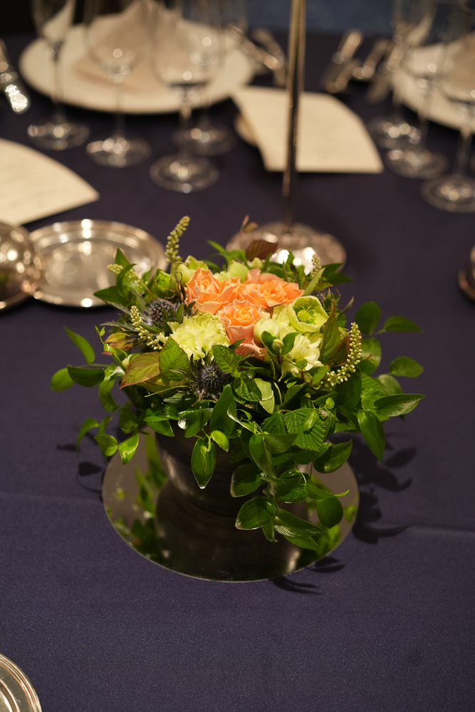 卓上装花の花の色はオレンジ!と最初からイメージしていて。ネイビーのテーブルクロスとグレーの器にオレンジの花。シックで、でも暗くならずに華やかなイメージ。