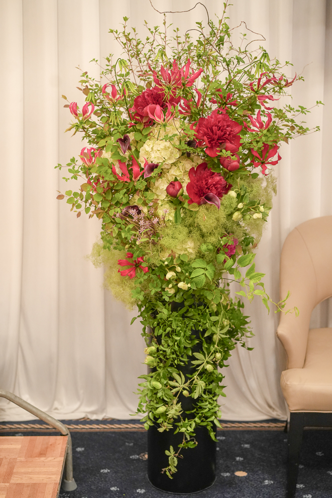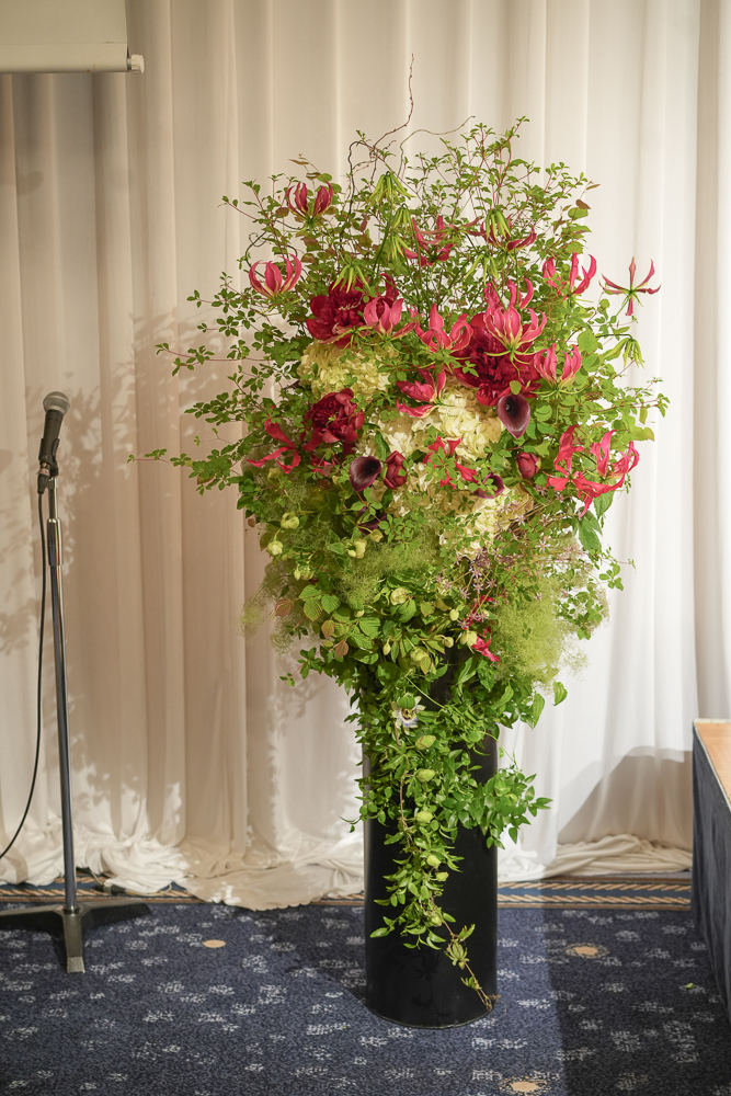 ローブでは、フラワーレッスン・ギフトの他にも、企業様のイベント・パーティー装花のお仕事も承っています。先日、企業様のパーティーイベントにて、卓上花とスタンド装花を担当させていただきました。