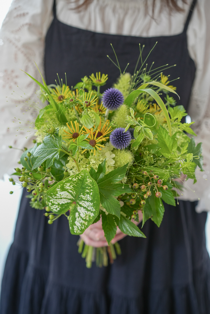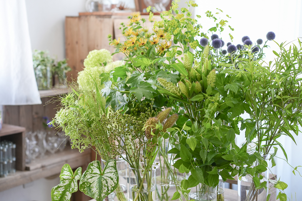 今月はそんな暑さを少しでも和らげられるような、涼を感じるグリーンが主役のブーケ。