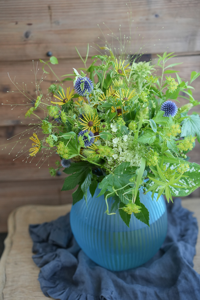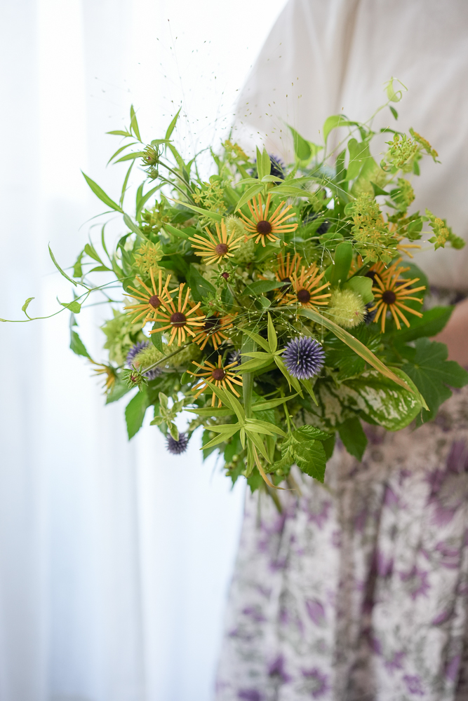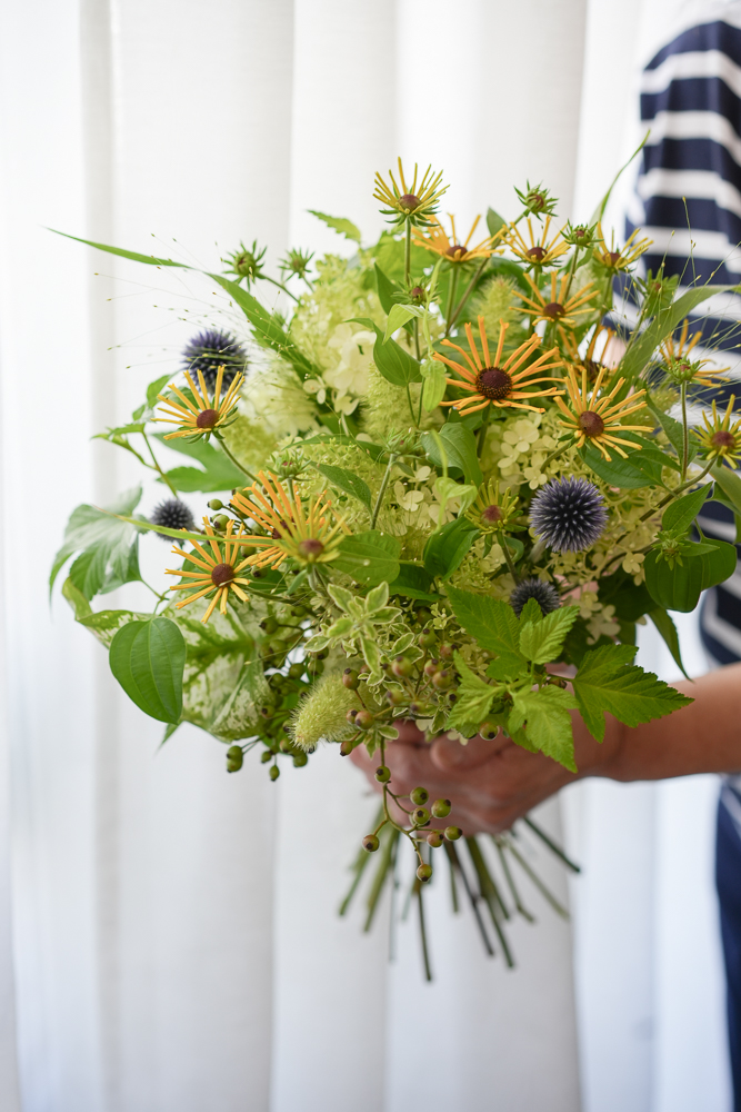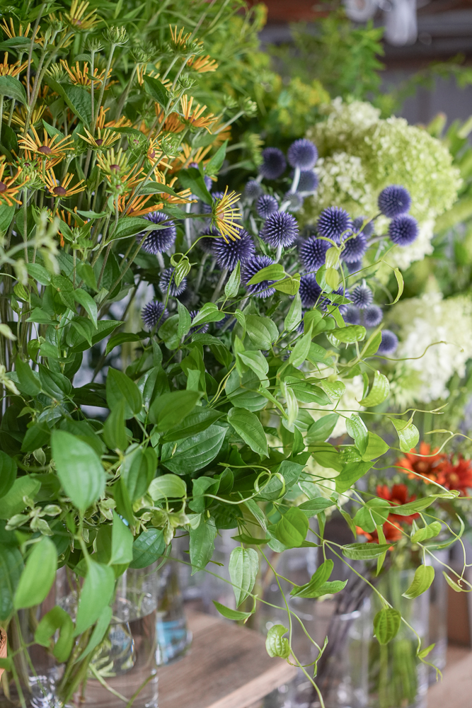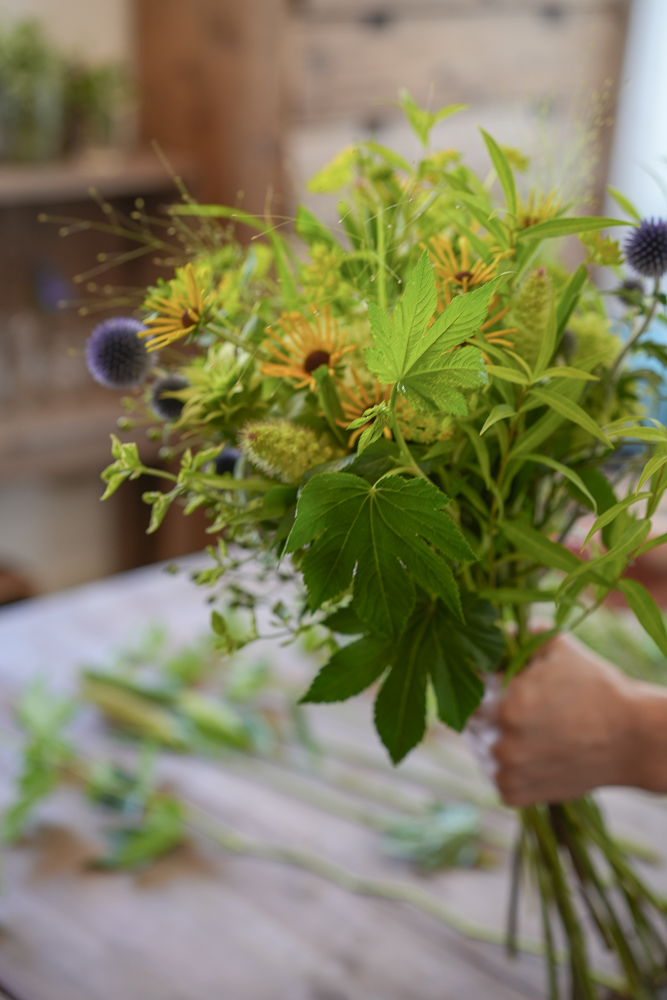 ルリタマアザミの紫を差し色に、アワ・リキュウソウ・スモークグラスで野原から摘んできたようなエアリー感もプラスします。