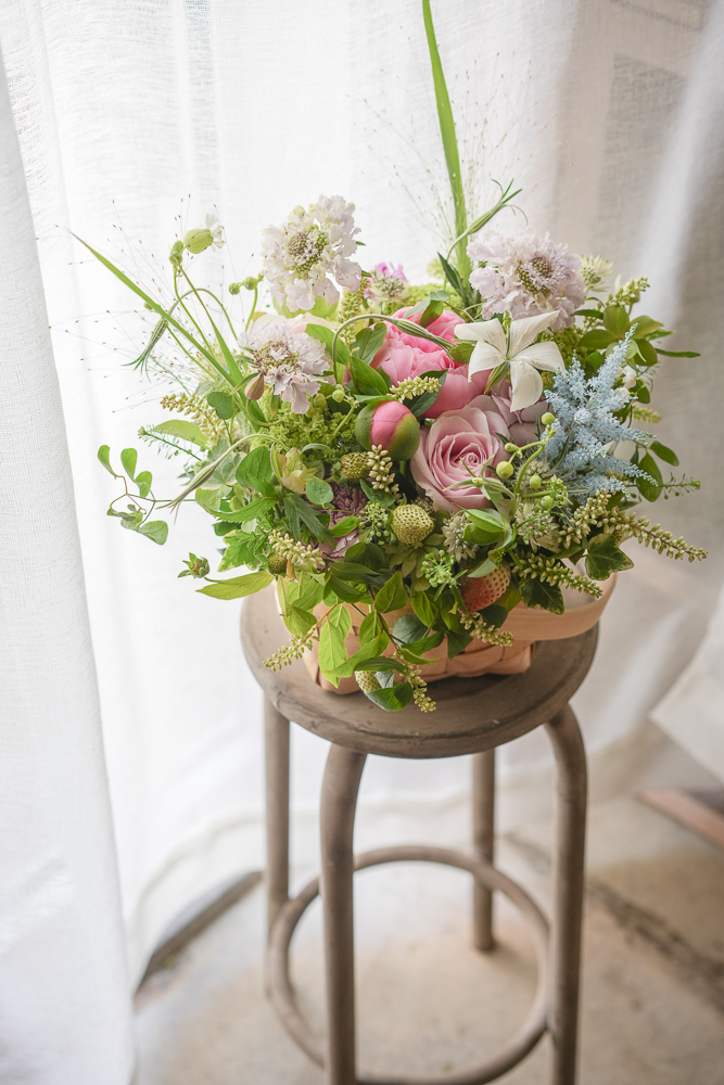 ナチュラルなウッドチップバスケットにお花をアレンジしてお作りします。お花が終わった後も小物を入れたり、使い方は色々。